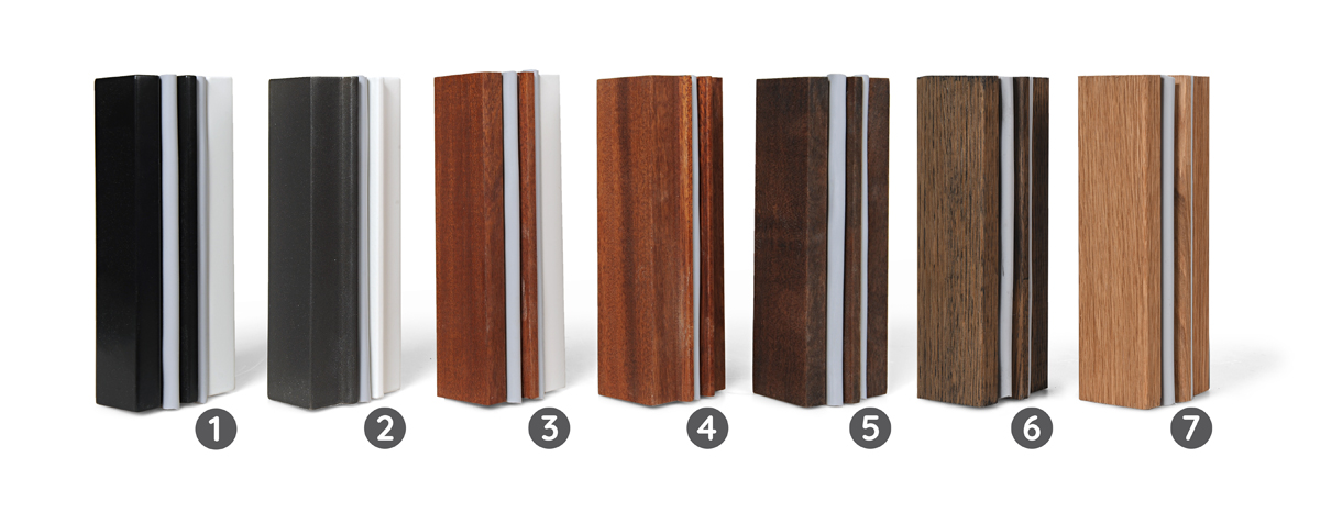 Examples: 1. Combination of RAL 9005/9010 2. Combination of RAL 7016/9010 3. Mahogany, combined with 9010 and linseed oil 4. Mahogany, oiled with cold-pressed linseed oil 5. Mahogany, with black-pigmented cold-pressed linseed oil 6. Oak, oiled with black-pigmented cold-pressed linseed oil 7. Oak, oiled with cold-pressed linseed oil