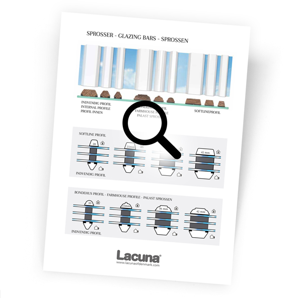 Lacuna producerer flere forskellige typer af sprosser og poster. De fleste af vore kunder vælger 25 mm palæsprosser med det vi også kalder bondehusprofil på indvendig side. Dette design fås også i 20, 36 og 42 mm bredde. For alle bredder fås også en indvendig softline profil, der giver et enkelt og moderne udtryk der matcher stilen i nye byggerier.